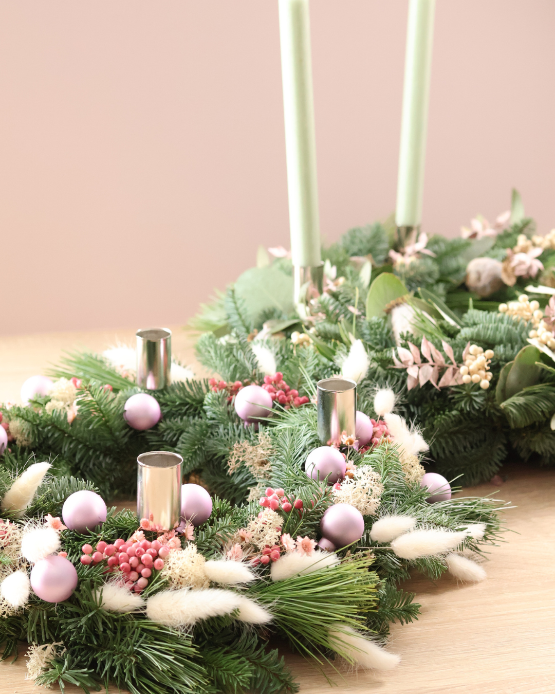 Außer der Reihe gestalten wir einen Adventskranz – kombiniert aus Tannenzweigen und Trockenblumen für einen festlichen Look. Es war das Weihanchtsgeschenk an die PlottZeit Crew.