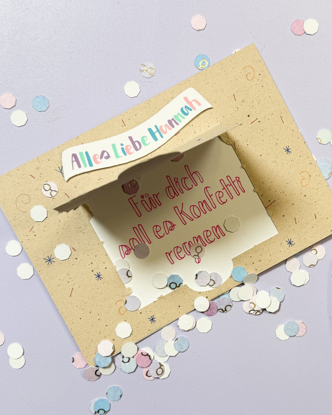 Das komplette Design haben wir in Deisgn Sa´pace selber zusammengestellt. Auch das Konfetti haben wir mit wenigen Klicks vom Plotter schneiden lassen.